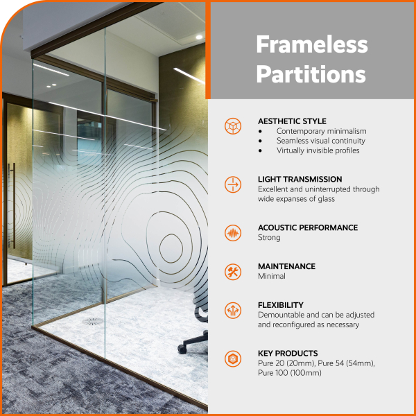 Modern frameless glass systems deliver impressive acoustic performance alongside their minimalist aesthetic, with frameless single glazed partitions and double glazed options like Pure 54 and the Pure 100 providing excellent sound insulation. Triple glazed Pure 200 is also available and more suited for windows – rather than full-height screens – ideal for environments such as recording or podcast studios.