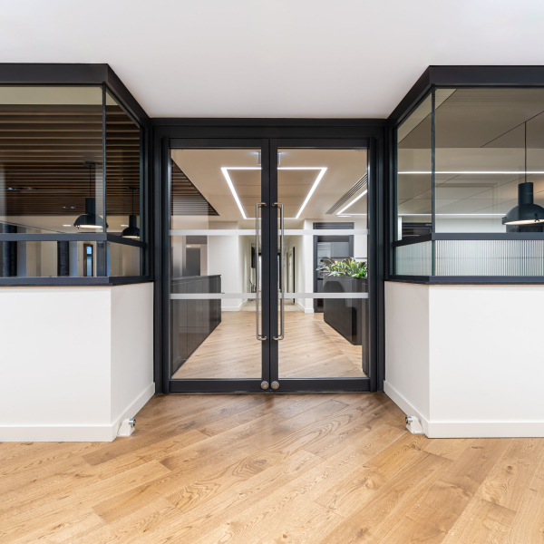 Furthermore, our high acoustic performance Linear 50 Plus single glazed partitions (up to Rw 41 dB) and a single glazed Hogan lobby double door set with access control completed the glazed partition package.
